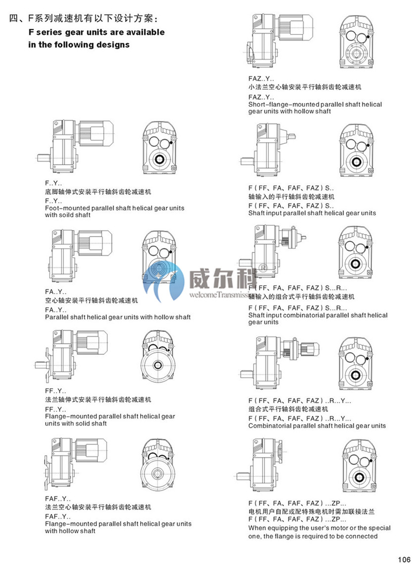 F57/FF57/FAF57系列平行軸斜齒輪減速機(jī),結(jié)合國(guó)際技術(shù)要求制造 ,具有很高的科技含量,節(jié)省空間,可靠耐用,承受過(guò)載能力高,功率可90KW一上,能耗低,性能優(yōu)越,減速機(jī)效高達(dá)95%以上 ,振動(dòng)小嗓音低,節(jié)能高,選用優(yōu)質(zhì)鍛鋼材料,鋼性鑄鐵箱體,齒輪表面經(jīng)過(guò)高頻熱處理,經(jīng)過(guò)精密加工, 確保軸平行度和定位的精度,這一切構(gòu)成了齒輪傳動(dòng)總成的減速機(jī)配置了各種類電極,形成了電極一體化,完全保證了產(chǎn)品使用質(zhì)量特性