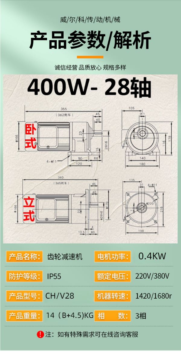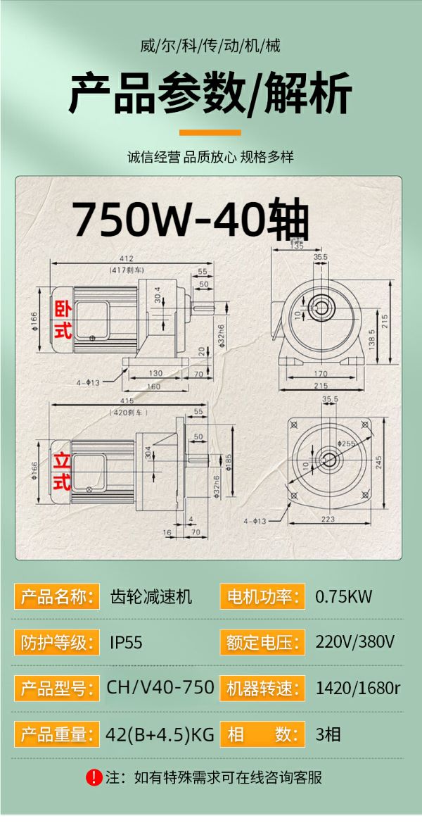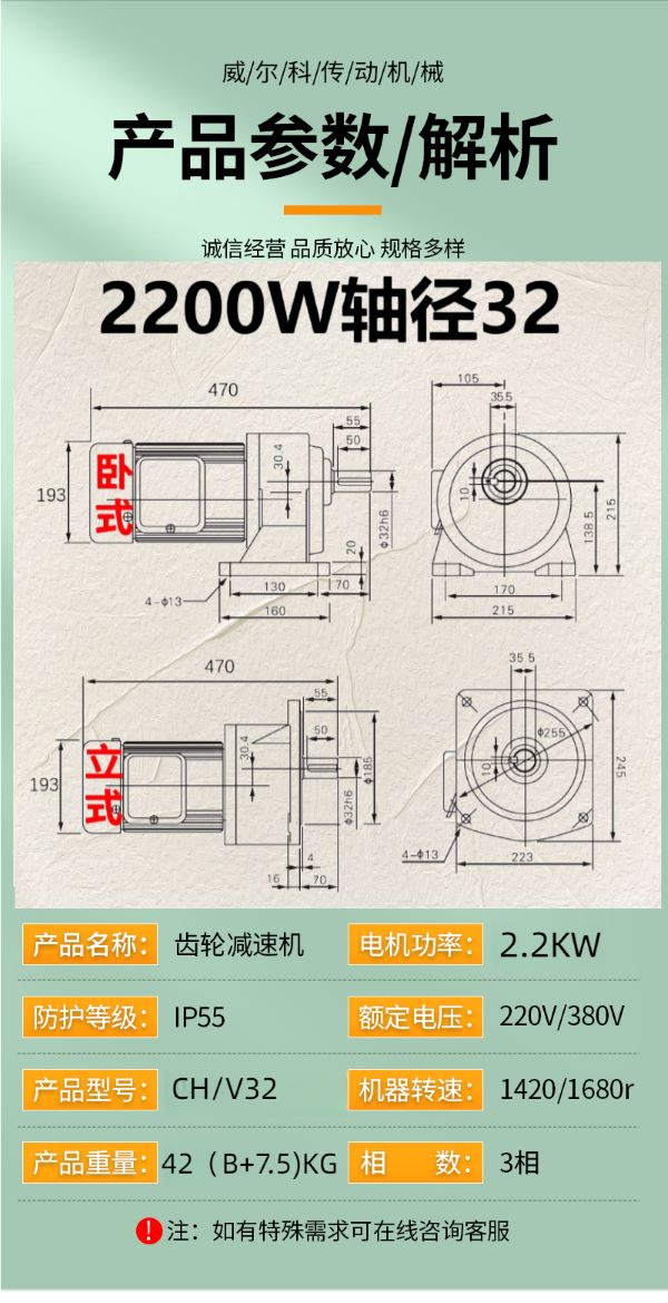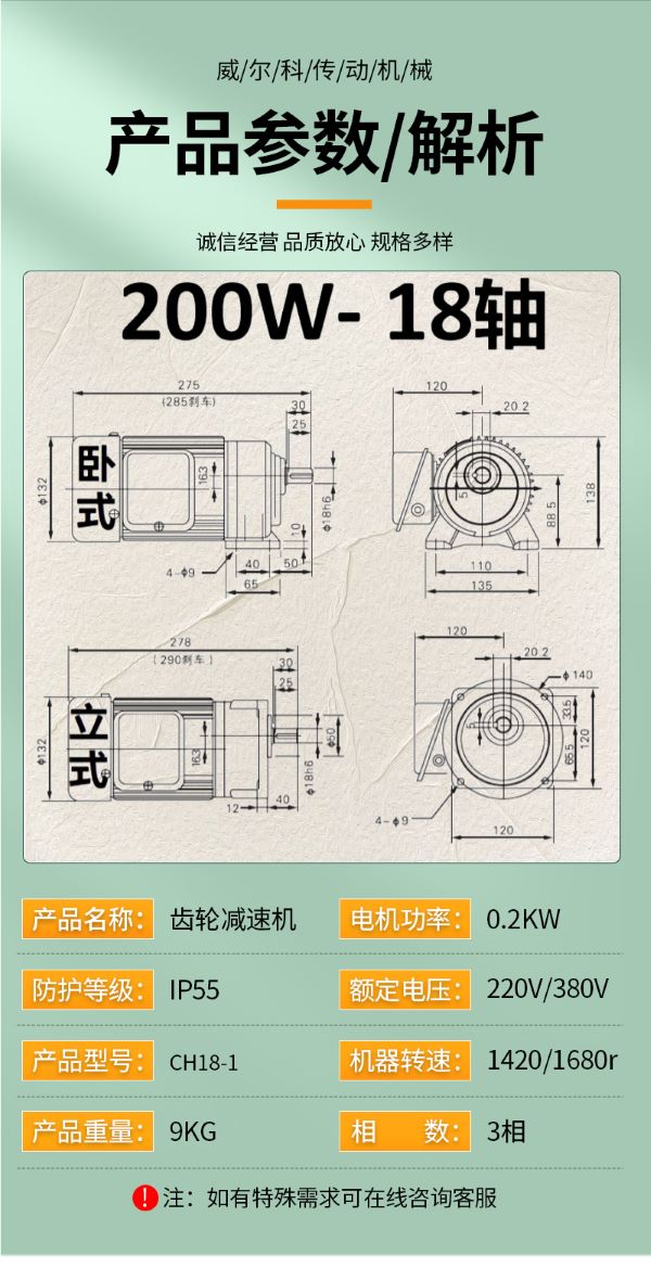 功率有: 100W(0.1KW減速機)、200W(0.2KW減速機)、400W(0.4KW減速機)、750W(0.75KW減速機)、1500W(1.5KW減速機)、2200W(2.2KW減速機)、3700W(3.7KW減速機)......